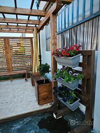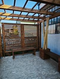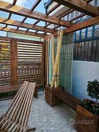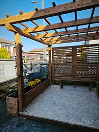 Pergolato in legno lamellare, dim. Copertura mt. 3x3, sez. legno 10x12. Possibilità di parete con grigliato a lamelle orizzontali. Sovrastruttura per piante arrampicanti. Fioriera di base. Luci led incorporate nei pilastri posteriori.