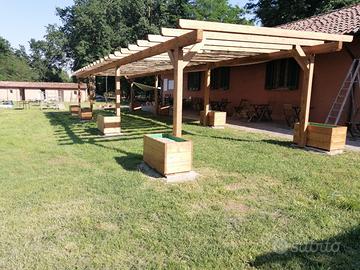 Pergolato autoportante fuori terra, con struttura legno lamellare e fioriere con funzione di zavorra. nella foto dimensioni mt. 15x4, Possibilità di tende a onda o qualsiasi tipo di copertura. Adatto per comunità, grandi giardini. Preventivi personalizzati. Chiedi un sopralluogo. Cell. 393.90.70.780
