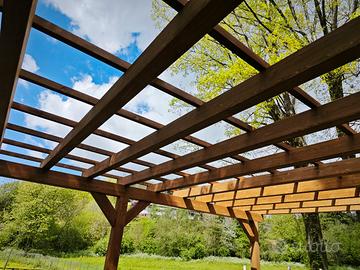 Pergolato qualsiasi dimensione. In foto 8.00x5.00, pilastrini 16x16, trave portante 16x20, travicelli 10x18. Altezza utile cm. 250. Al mq. € 155,00 compreso trasporto nel raggio di 80 km, montaggio con staffe in ferro trattato a polveri, impregnatura colore noce.