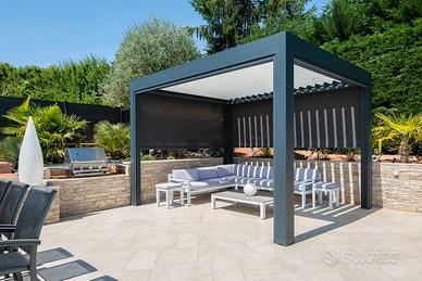 Vendiamo pergole bioclimatiche e pergotende nuove addossate, con copertura con lamelle in alluminio orientabili, a completa tenuta d'acqua, completamente impermeabile o con copertura a scorrimento su guide retraibile e chiudibile a pacchetto in pvc precontraint blockout , 622 bianco o avorio, con montanti frangivento rompitratta e con tettoia di protezione.