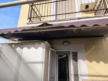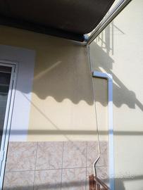 Vendo pergola addossata al muro con telo avvolgibile, misure 4 metri x 5,5 metri. Struttura in alluminio verniciato color bianco/crema, in buone condizioni con qualche normale segno d'uso. Telo scorrevole di colore antracite/nero, funzionante. Apertura e chiusura manuale a manovella.