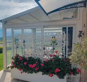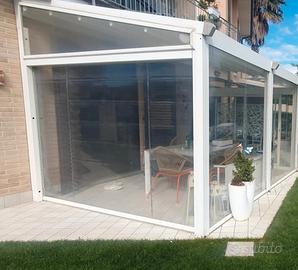 Chiusura a tetto 4x3 motorizzata, n.2 chiusure frontali e n.1 chiusura laterale trasparenti motorizzate. Aggiungo inoltre n. 2 tende frontali forellate bianche.