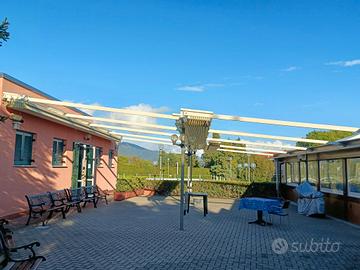 Tenda pergola Pratic di grandi dimensioni, formata da quattro settori a movimento indipendente fornito da quattro motori indipendenti telecomandati, struttura di sostegno in acciaio inox.