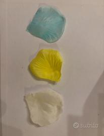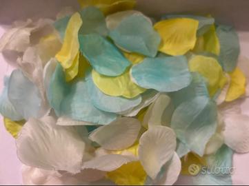 petali decorativi in tessuto sintetico (tipo poliestere), misti nei toni giallo-azzurro-bianco