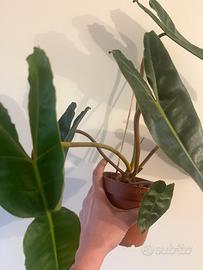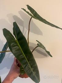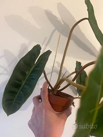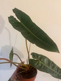 Pianta di Philodendron billietiae con foglie lunghe e lanceolate.