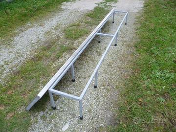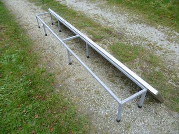 Supportato da un telaio in ferro con tubi quadrati e piedini, della misura di : lunghezza, m. 2,80 larghezza cm.35 e altezza cm. 31.