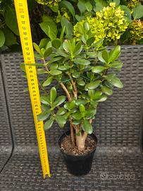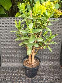 Pianta di Crassula ovata, Albero di Giada, è una pianta succulenta a coltivazione facile. I fiori sono raccolti in grandi ombrelle che spuntano dagli apici: hanno forma di stella, nei colori dal bianco al rosa tenue. La loro apparizione avviene, negli esemplari di grandi dimensioni, durante la stagione invernale.