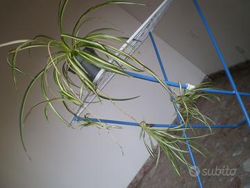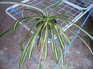 DESCRIZIONE: Falangio Nastrino; questa pianta ha la caratteristica di depurare l’aria in casa ed è una pianta erbacea perenne, produce lunghi stoloni penduli all’estremità dei quali si sviluppano piccole piantine che radicano spontaneamente a contatto con il terreno. La pianta raggiunge l’altezza di circa 25 cm e le foglie basali, disposte a rosetta, molto ricurve all’infuori sono larghe 2 cm, di colore verde chiaro e variegate di bianco all’interno della foglia; fiorisce nel periodo estivo con piccoli fiori di colore bianco; piante che stanno bene sia in casa nel vaso che anche esternamente nel terreno o in balcone/terrazza o in ufficio; le foto rispecchiano la realtà delle piante nello stato attuale