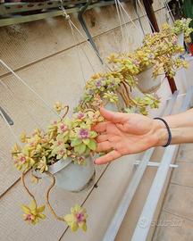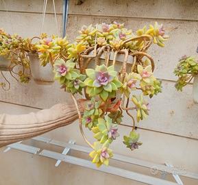 pianta grasso in vaso da appendere dal nome graphopetalum paraguayense. pianta grassa che non ha bisogno di alcuna cura solo un po' d'acqua d'estate, e se dovesse mancare l'acqua lei sopravvive lo stesso.
