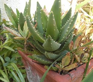 Vendo pianta grassa sottospecie aloe. Ne possiedo una alta 70 cm che si moltiplica annualmente . Per questo ne ho diverse, sono molto facili da accudire, non necessitano di molte cure e poca acqua, sono le piante ideali per le prossime estati. Io te ne propongo una di circa 20 cm dal suolo più radici che ti spedisco confezionata col suo terriccio in un involto di tessuto, avvolta in carta in una scatola di cartone. E' una pianta robusta e può affrontare benissimo il viaggio. Questa è la stagione adatta per il rinvaso. Una volta nella sua nuova casa non dovrai far altro che scartarla con cura e interrarla in un vaso possibilmente di terracotta fino alla foglie verdi, non innaffiare per tre giorni. Fiorisce in estate. E dopo tutte queste informazioni non ti resta che adottarne una.