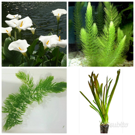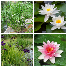 Piante acquatiche varie, che svolgono una naturale ed eccellente azione fitodepurante, ossigenante ed ombreggiante, oltre ad un piacevole effetto ornamentale nel laghetto e nell'acquario. Ho splendide ninfee di varie dimensioni e colori (bianca, rosa, viola), piante sommerse di Vallisneria gigantea, Ceratophyllum demersum, muschio d'acqua e alga Marimo, piante galleggianti di Lemna minor (lenticchia d'acqua), Lemna major (lenticchia d'acqua gigante) e Pistia stratiotes (lattuga d'acqua), piante palustri di Cyperus, calla e iris.