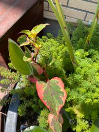 Houttuynia Cordata Chameleon 10 euro. Tre/quattro steli di pianta.Si tratta di una pianta palustre, alta 30/40 cm. In primavera crea dei piccoli fiorellini bianchi.