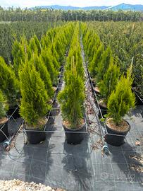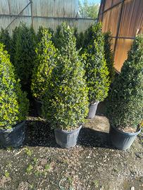 Buxus (Bosso): Elemento fondamentale per l'arte topiaria e le siepi formali, disponibili in diverse misure tra cui Buxus Sempervirens e Buxus Faulkner.