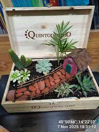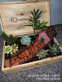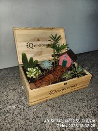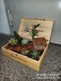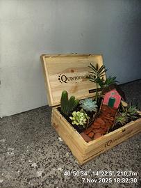 CASSETTA DEI VINI CONTENENTE UNA COMPOSIZIONE DI PIANTINE GRASSE VERE, CON TEMA CASETTA DI CAMPAGNA.