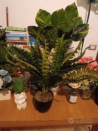 Piante finte ornamentali , compresi due vasi bianchi di buon gusto , nell' ultima parte l' intrusa davanti è una finta edera del diavolo
