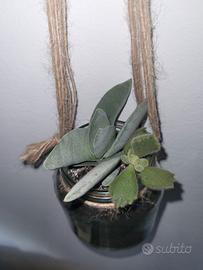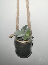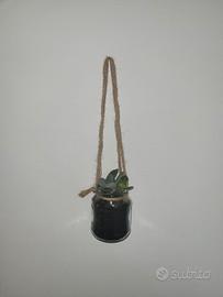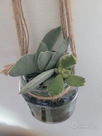 Composizione con piante grasse in vasetto di vetro da appendere. Il cordino si può legare a fiocco ed utilizzare come vaso soprammobile. Piante resistenti al chiuso o all'aperto in tutte le stagioni. Misure vaso 12 x 8 cm circa. Realizzo anche su richiesta composizioni più grandi. Ritiro a mano Torino zona Santa Rita. Possibile spedizione.