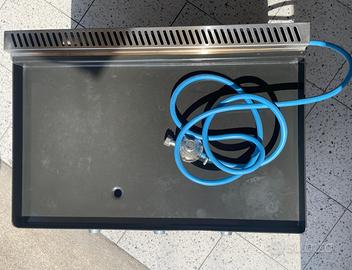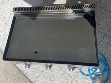 La piastra a gas è dotata di tre bruciatori che creano diverse zone di calore. La superficie di cottura in ghisa smaltata è molto facile da pulire e misura 72 x 41,6 cm. I bruciatori in ghisa hanno una potenza totale di 7,2 kW. Molto semplice da utilizzare grazie all'accensione piezoelettrica e lo scarico per il grasso dotata di cassettino. Incluso cedo attacco per bombola a gas e utensili della Overmont.