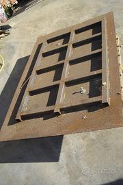 Piastra in ferro con telaio inferiore,chiudeva una fossa 140 x 90 cm,che e' la misura del rinforzo che si vede in foto,mentre la misura della superficie superiore e' 180 x 120 cm,la lamiera superiore e zigrinata,ottime condizioni.