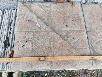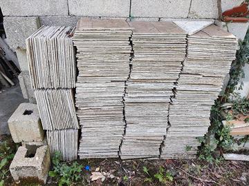 Oltre 30 m2 di piastrelle in gres porcellanato, con residui della colla di posa. Provenienti dal rifacimento di una terrazza di circa 36 m2 . Un certo numero sono tagliate a metà diagonalmente. Misura circa 30x30 cm. Per terrazze, taverne e simili, vedere il disegno in foto. Vendita solo il blocco intero.