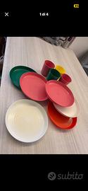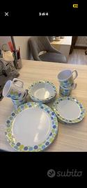 Vendo tutto insieme, set di 4 piatti piani, 4 fondi e 4 da frutta con 4 tazze coordinate, 8 tovagliette in plastica e 6 piatti plastica rigida con 4 bicchieri, 6 bicchieri da bibita