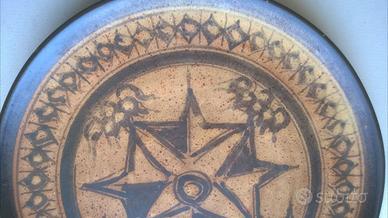 Questo piatto decorativo in ceramica è un’autentica opera d’arte artigianale, realizzata e dipinta a mano con motivi geometrici e floreali ispirati al folklore mediterraneo. Il disegno centrale a stella radiale a otto punte dona forza e simmetria alla composizione, mentre la palette di colori caldi (ocra, marrone, nero) richiama le tradizioni ceramiche del Sud Italia.