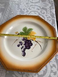 Vendo piatto ottagonale in ceramica decorato a mano con bordo lavorato. Decoro uva in stile autunnale. Misure: 35cm diametro