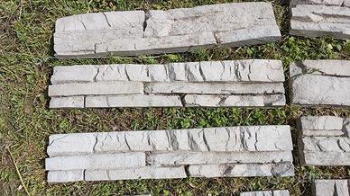 Stock da 21 pezzi di pietra ricostruita colore grigio chiaro, varie lunghezze da 18 a 50 cm, altezza 10 cm spessore 2/3 cm, circa 1 metro quadro. Materiale di avanzo di un mio lavoro. Ritiro a Brescia città