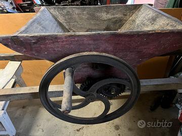 pigiatrice a mano in legno con ruota in ghisa, sostenuta da due stanghe, ben tenuta e ottima anche per essere trasformata in oggetto di arredo