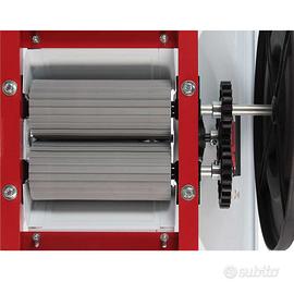 Pigiatrice per la lavorazione dell’uva, il compromesso ideale per chiunque desideri un modello di pigiatrice né troppo grande né troppo piccolo. Struttura curata in ogni particolare e materiali di qualità ne costituiscono i punti di forza, insieme ai suoi componenti che ne garantiscono robustezza e durata nel tempo. Tramoggia, barella e agitatore sono in acciaio smaltato e il volano, che ne consente l’uso manuale, trasmette il moto rotatorio a ingranaggi, agitatore e rulli, il tutto finalizzato allo schiacciamento dell’uva. Così come i rulli, anche gli ingranaggi sono in nylon: questo garantisce lunga durata del prodotto e un miglior trattamento delle sostanze alimentari. Particolari supporti permettono la regolazione dei rulli di qualche millimetro.