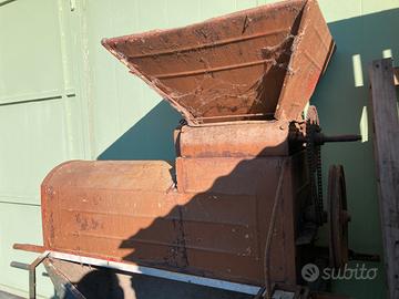 Pigiatrice per uva vintage in metallo, completa di tramoggia, vasca di raccolta e supporto con ruote. Ingranaggi presenti ma manovella mancante