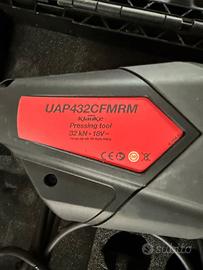 pressatrice a batteria, utilizzata per unire tubi in impianti idraulici o di riscaldamento. Modello: Klauke UAP432 CFMRM (spesso brandizzata o compatibile con Makita). Alimentazione: Batteria al litio da 18V. Caratteristiche: Dispone di un sensore di pressione che monitora ogni ciclo di pressatura e luci LED per l'area di lavoro. Utilizzo: Professionale, per raccordi in multistrato, rame o acciaio.
