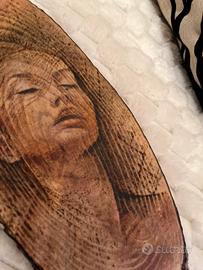 Pirografia incisa a mano su legno di pino, con corteccia sull’intera circonferenza, raffigurante “viso di donna”, utilizzabile sul retro come piccolo tagliere o appeso come un quadretto, realizzato artigianalmente, tramite incisioni realizzate a fuoco con pirografo.