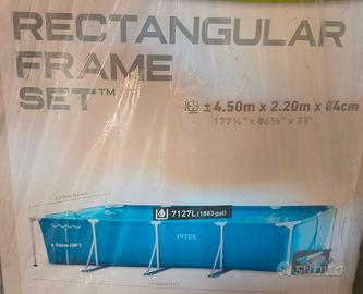 Grande piscina fuori terra rettangolare Intex 28273NP dimensioni 450x220 cm. Oltre alla piscina e al suo kit base includo: - pompa di filtraggio - skimmer - telo di copertura - attrezzi per la pulizia Tutto originale Intex. La piscina è molto ampia e confortevole per bambini e adulti, oltre 7.000 litri. Il kit fornito permette di avere acqua perfetta con ridotti tempi di manutenzione. Acquistata nel 2024, usata una sola stagione, poi riposta in ottime condizioni nell'autunno 2024 e non rimontata nel 2025. La consegno già smontata negli scatoloni originali come da foto. La prima foto è da catalogo, le altre sono dell'oggetto in vendita e dei suoi accessori. Non spedisco perché troppo ingombrante. Facilmente trasportabile in auto.