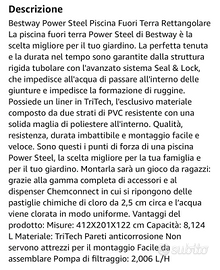 Piscina fuoriterra dimensioni 4mX2mx1,2m seminuova, completa di ogni accessorio. Usata pochi giorni. La descrizione completa è nelle immagini illustrative.