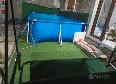 Piscina Bestway 4x2 metri (5700 litri) in buone condizioni corredata di pompa filtro a sabbia da 1800 litri/h, 2 secchi da 14 litri di sabbia al quarzo specifica,tubi, raccordi, kit pulizia, retino, skimmer, scorta di pastiglie di cloro, prodotti di regolazione pH dell'acqua, misuratore di cloro e pH dell'acqua, fungo dosatore cloro.
