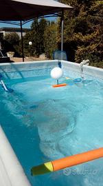 Piscina con struttura metallica e pompa di filtraggio più accessori. dimensioni circa 4.5x2.5 altezza 1.2