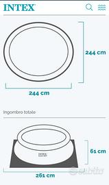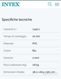 Realizzata interamente in PVC, è una piscina autoportante, grazie alla tecnologia dell’anello superiore gonfiabile, che garantisce totale sicurezza. Il liner in PVC utilizza la tecnologia Super-Tough brevettata da Intex. Facile da montare e semplice da riporre una volta terminata la stagione.