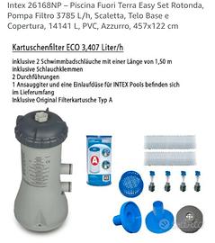 Realizzata in resistente e durevole PVC a triplo strato, hai tutta la stabilità necessaria senza alcuna struttura metallica. La finitura superiore è infatti composta da un anello gonfiabile: ti basta gonfiarlo e la piscina è pronta per essere riempita! Il montaggio richiede solo 15 minuti. Il liner interno, con stampa mosaico, rende l’acqua cristallina e di un azzurro più intenso. La confezione include una pompa filtro a cartuccia con portata 3785 L/h. È dotata di sistema di aerazione che migliora la filtrazione e aumenta la purezza e la chiarezza dell’acqua. La scaletta è inclusa.