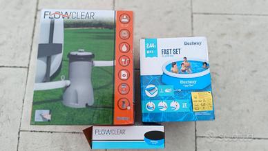 Vendo PISCINA GONFIABILE 244X61 CM FAST SET BESTWAY completa di telo di copertura e pompa (filtro da acquistare). Ha un piccolo foro nell'anello che non ne compromette l'utilizzo, come da foto. Disponibile a spedire con corriere espresso.