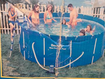 piscina di forma circolare diametro m.3,66 h1,20 con scaletta con pedanina per tuffi, pompa per riciclo acqua, contenitore galleggiante per pasticche di cloro, retino per pulizia, e telo di copertura.Tutto in ottimo stato, usata una sola estate.€ 200