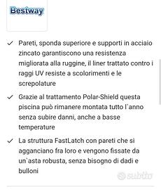 Per rinnovo giardino vendo a malincuore questa piscina con 2 depuratori uno originale uno di altra marca. Comprata 2 anni fa ma l'anno scorso usata pochissimo. Unico difetto in un punto si è sbiadito il colore del telo perché è caduto pastiglia cloro. Compresa della sua scala originale e telo originale di copertura. Provincia di Bergamo Prezzo €800