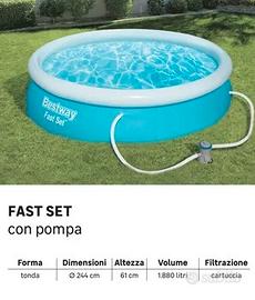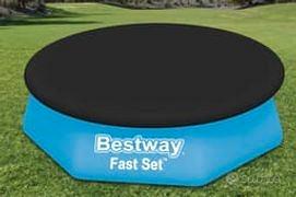 Piscina Bestway autoportante (prezzo da nuovo 60€) con: pompa per il ricircolo e la filtrazione dell'acqua (prezzo da nuovo 40€), telo per il fondo (prezzo da nuovo 20€), tappeto a puzzle spugnoso (prezzo da nuovo 25 euro ogni 6 pezzi, totale 18 pezzi) e telo di copertura (prezzo da nuovo 20€). In omaggio prodotti vari per la regolazione del pH, antialghe e una pompa di scorta. Usata un solo anno, presenta un leggero sbiadimento della trama del fondo, per il resto è perfetta.