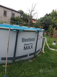 Vendo piscina marca Bestway rotonda di due anni come nuova per cambio modello di altezza 1.22m e diametro di circa 5 metri. La vendiamo compresa di scala, pompa a sabbia e lo skinner