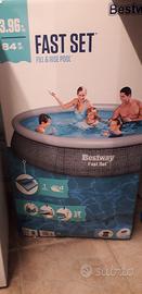 vendo piscina bestway tonda diametro 3,96 x 84 centimetri di altezza utilizzata 1 stagione, presenta lieve macchia sul fondo per cloro, vendo per inutilizzo