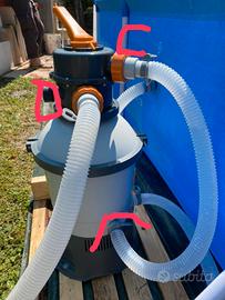 piscina Bestway 450x220, completa di: telo copri piscina; filtro a sabbia; schimmer; dosatore per pastiglie; accessori pulizia; prodotti trattamento acqua, boccette di misurazione cloro e ph.
