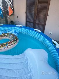 Tutto quello che vi serve per passare una estate al fresco. La piscina ha un diametro di 3m ed è completa di tutto: - aeratore per idromassaggio - pompa sovradimensionata da 3000 l/h - ozonizzatore completo di ricarica nuova di essiccati per la disinfestazione dell'acqua senza l'uso di cloro - telo di copertura Bestway a misura - tutte le tubazioni ed accessori La piscina è stata montata su un terrazzo per cui è stata sempre riempita al 50% della sua capacità. Presenta segni di usura come da foto (della ruggine negli attacchi e sui punti di appoggio) ma non ha buchi ed è completa di tutti i chiodini di fissaggio più alcuni extra. Completa di manuale. Ritiro in provincia di Rimini .
