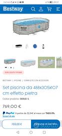 Non lasciare che il caldo torrido rovini la tua estate! Cosa c'è di meglio di tornare a casa dal lavoro e mettersi a bagno bevendosi una roba? Lanciaci dentro i figli e lascia che sguazzino fino a sera. Prendi una piscina e risparmierai sull'aria condizionata, ne guadagnerai in freschezza e relax! Usata solo una stagione, nessuna riparazione, completa di pompa, scala e accessori. Basta darle una pulita e torna come nuova. Nelle foto è moscia perché la abbiamo aperta ora per controllarla, una volta riempita è perfetta! Dimensioni: 4,88 m x 3,05 m x 1,07 m Forma: ovale Robusta struttura in acciaio con raccordi Seal&Lock per prevenire la formazione di ruggine Il liner in Tritech a tre strati è rinforzato contro strappi e forature, per garantire tenuta e durevolezza Oblò trasparenti sulle pareti, per una divertente esperienza interattiva Montaggio fai da te senza bisogno di attrezzi Include sistema completo di trattamento dell'acqua, con pompa di filtraggio a sabbia e dosatore cloro ChemConnect. No spedizione che è molto voluminosa Prezzo trattabile