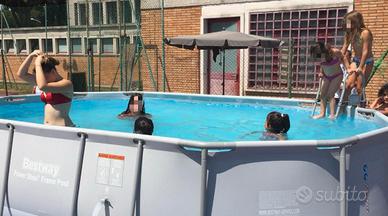 Vendo piscina ovale Bestway con scaletta + pompa con filtro a sabbia + una piscina piccola in regalo. Altezza: 107 cm Lunghezza: 488 cm Largezza: 305 cm Capacità: 7250 litri Capienza piscina per 5-6 persone 🎁 con l’acquisto in regalo un piscina piccola