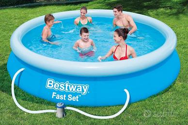Un semplice angolo di svago pronto in pochi minuti? È proprio una piscina Fast Set! Basterà scegliere una superficie in piano, gonfiare l’anello superiore, mettere l’acqua e il gioco è fatto. La confezione include piscina, pompa filtro a cartuccia e toppa di riparazione.
