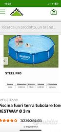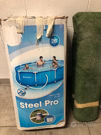 Piscina Bestwey Steal Pro circolare dim 305x76h + retino+ teemometro galleggiante+ porta pasticche cloro galleggiante+ spazzola pulisci fondale+ spazzola piccola+ telo copri piscina+ filltro nuovo per pompa elettrica + 2 tappeti sintetici erba da 2x 3. Usata solo 3 mesi in due anni.